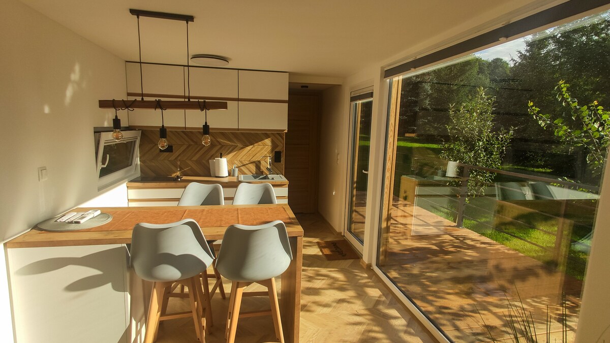 Ova seoska kuća izgrađena 2025. godine u američkom stilu je zaista posebna. Nalazi se direktno na jezeru u kojem su, pored koi šarana, aktivne i mnoge ptice. Zgrada WC šolje je odmah pored nje, ali je zasebna zgrada, što je lijepo ako ste sa nekoliko gostiju. Voda u tuš-kabini se zagrijava na struju. Grijanje i hlađenje se vrši pomoću toplotne pumpe. S velikog panoramskog prozora pruža se ne samo prekrasan pogled na jezerce, već i na selo oko njega.