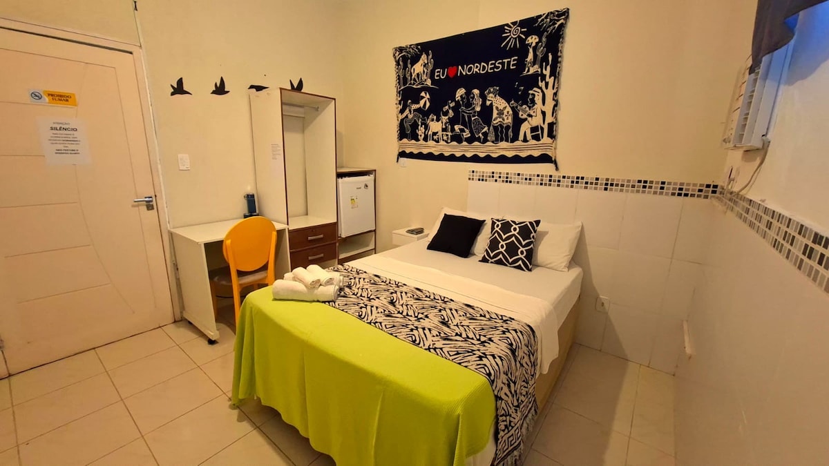 Hospede-se em um quarto confortável para duas pessoas, equipado com cama de casal (normal), ar-condicionado, frigobar e banheiro privativo. Nossa área externa é compartilhada por hospedes e moradores da casa sendo composta por redes, sofás, mesas, cadeiras e TV. Nosso espaço é perfeito para, após um dia de sol se banhando nas águas do velho Chico, renovar as energias e curtir a noite no Centro histórico.
