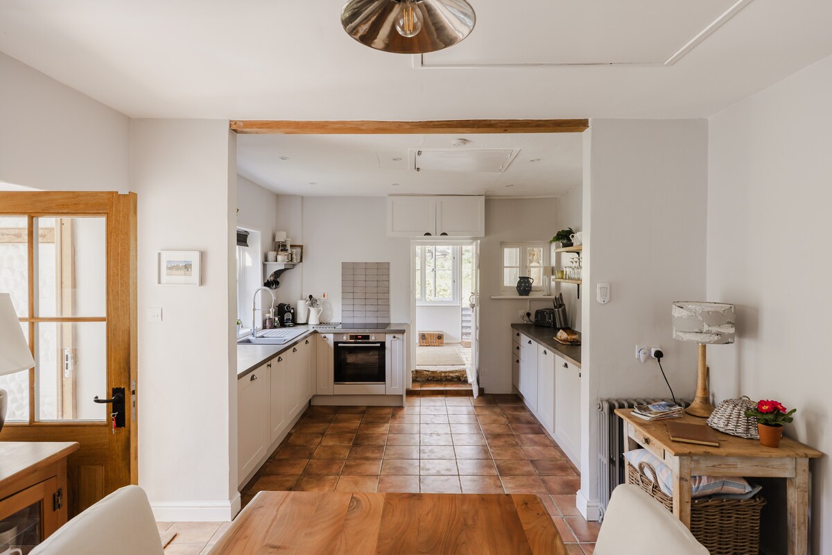 Tradicionalna seoska kućica od kremena (ne niski plafoni!) - sigurna bašta, veoma udobni kreveti sa posteljinom kompanije White Company, peškirima + dodacima za kupatilo; porodično kupatilo sa duplim kupatilom + tuš kabina za tuširanje, kuhinja, dnevna soba sa gorionikom na drva, trpezarija sa gorionikom na drva; putni krevetac, stolica za hranjenje, zaštita za krevet, kapije za stepenice; pomoćni prostor + udobna/TV soba. Igraonica u garaži sa stolnim tenisom, bilijar stolom, pikadom + dodacima za plažu. Dobro se ponašaju psi, dobrodošli, uz malu naknadu. Sky TV + Wi-Fi.