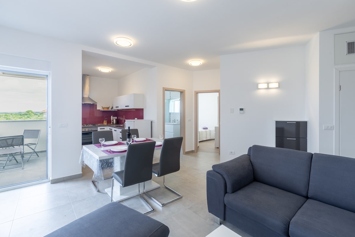 Predivan moderan stan sa pogledom na more i nacionalni park Brijuni. Nalazi se 300 metara od predivnih plaža i predivnog kampa Brijuni. Potpuno opremljen. 2 spavaće sobe, dnevni boravak, trpezarija, kuhinja, toalet, parking, besplatan Wi-Fi. Svaka soba ima sopstveni klima-uređaj i pametni TV sa besplatnim Netflix-om