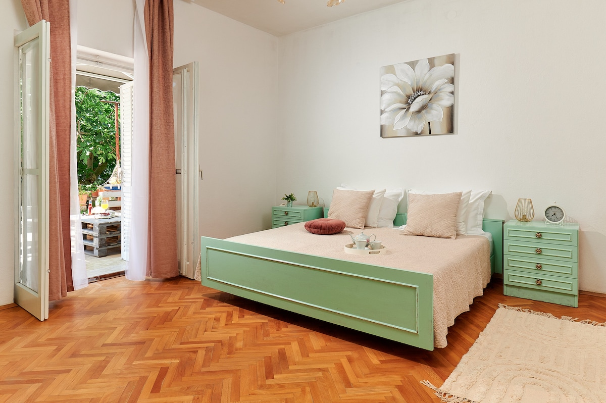 Novo renoviran i osunčan stan se nalazi u predivnoj vili klasičnog stila iz 1930. godine. Iz apartmana se pruža pogled na ostrva koja okružuju Split i pogled na jedinstvenu baštu vile kroz koju ćete proći da biste došli do plaže. Ovaj stan od 75m2 idealan je za smeštaj dve do četiri osobe. Ima privatno parkiralište ako dolazite s autom. Stan se nalazi na 10 minuta hoda od Dioklecijanove palate, užurbane pijace, Prokurative i Rive.