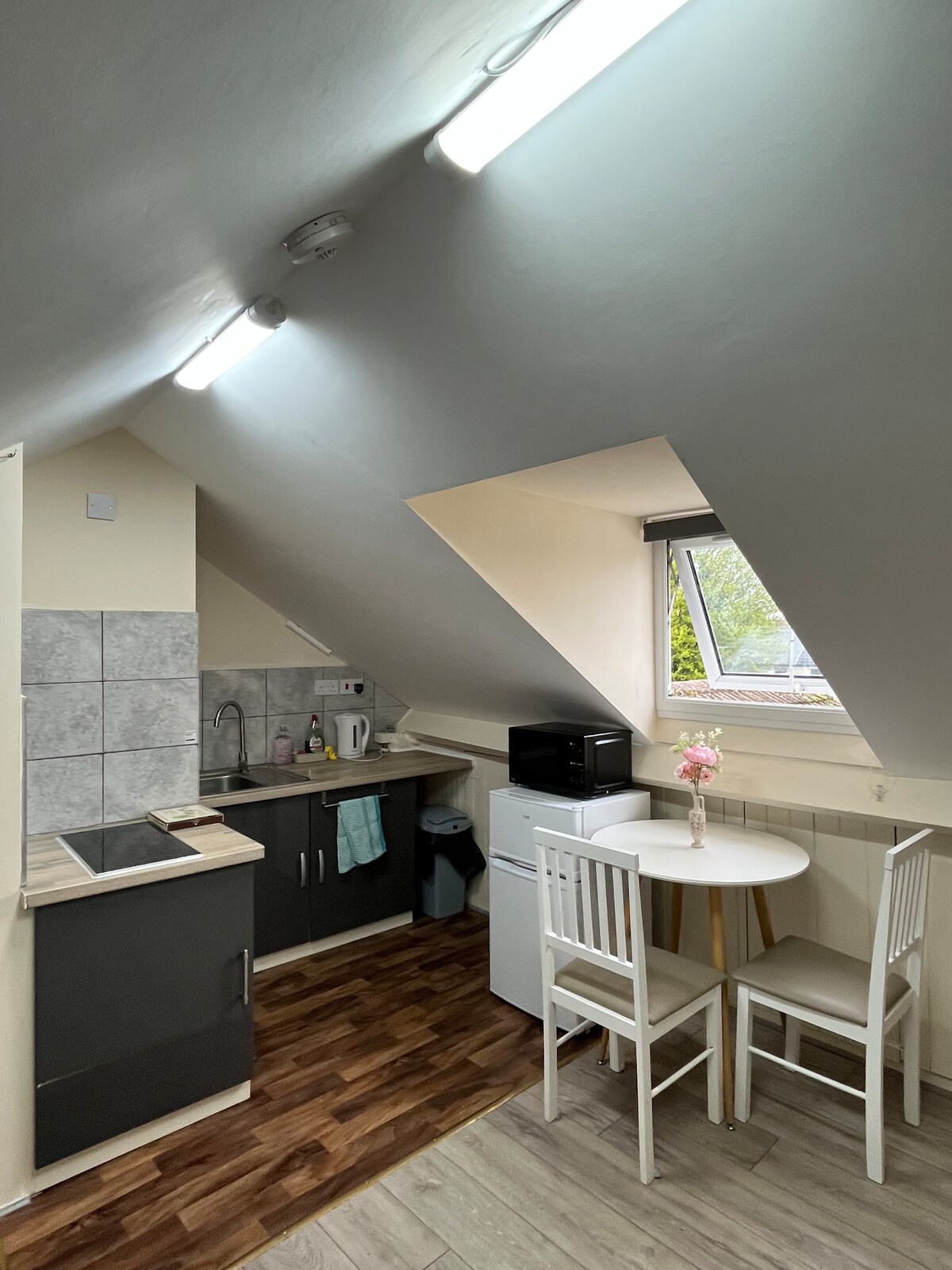 Studio je moderan, samostalan i elegantan prostor sa velikim bračnim krevetom i potpuno opremljenom kuhinjom. Odvojeni prostor sa bezbjednim Wi-Fi mrežom, terenskim parkingom i privatnim ulazom, savršen za samostalne boravke i poslovna putovanja. Smješten u živopisnom selu koje se nalazi na otvorenim poljima i nedaleko od paba The Crown. Samo 2 milje od železničke stanice Haddenham & Thame (direktna veza sa Oksfordom i Londonom), 15 minuta od autoputa M40 i 4 milje severno od Thame. Nije prikladno za djecu do 2 godine.