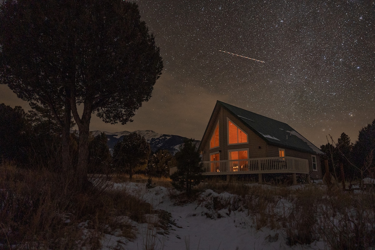 Pobjegnite od svega u našoj zabačenoj, savremenom stilu, kuća na drvetu u Koloradu, koja se nalazi u planinama Sangre De Kristo na nadmorskoj visini od 3 km. Opustite se na terasi i uživajte u veličanstvenom pogledu na vrh Kulebra ili gledajte u zvjezdano nebo. Mala peć na drva će vam pružiti udobnost i toplotu. Sekcijski kauč se koristi kao krevet velike veličine. Starija djeca (ili odrasle osobe prosječne veličine) mogu da spavaju u malom potkrovlju iznad glave na gornjem dijelu od pjene od 3 inča.