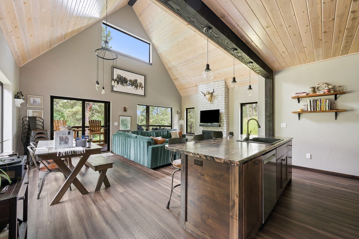 Praktično smještena samo 2 milje izvan istorijskog Dedvuda, 11 milja od legendarnog Sturgisa i 8 milja od skijaškog doma Teri Pik, ova osamljena moderna brvnara smještena je među borovima i mladim šumarkom jasena. Veliki prozori sa slikama ističu stambene prostore, a gruba rezana terasa odražava savršen planinski bijeg za uživanje u jutarnjoj kafi među savijenim hrastovima. Uživajte u divljim životinjama koje često posjećuju ovaj mirni objekat dok se opuštate u potpuno novoj hidromasažnoj kadi.