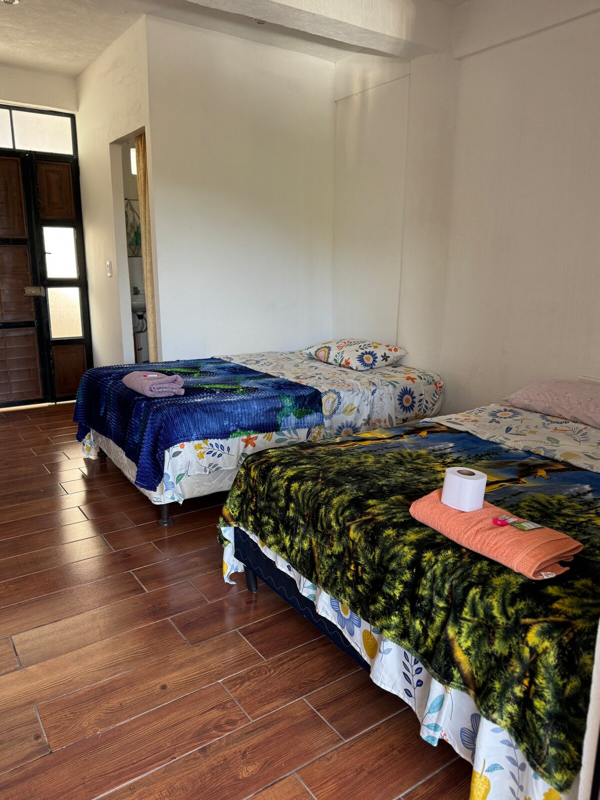 Gosti će imati pristup drugom spratu kuće koja se nalazi u centru grada, samo nekoliko koraka od pijace. Uživajte u veličanstvenom pogledu na vulkan San Pedro. Dva bračna kreveta u jednoj velikoj sobi i 1 krevet u manjoj sobi koja može da primi 5 osoba sa tuš kabinom i kupatilom na solarni pogon. Dostupan je pametni TV. Parking nije dostupan na licu mesta. Ako imate vozilo, možete da organizujete parking u blizini. KUĆNI LJUBIMCI NIJESU dozvoljeni. Internet je dostupan, ali nije stabilan jer je iz lokalnog grada.