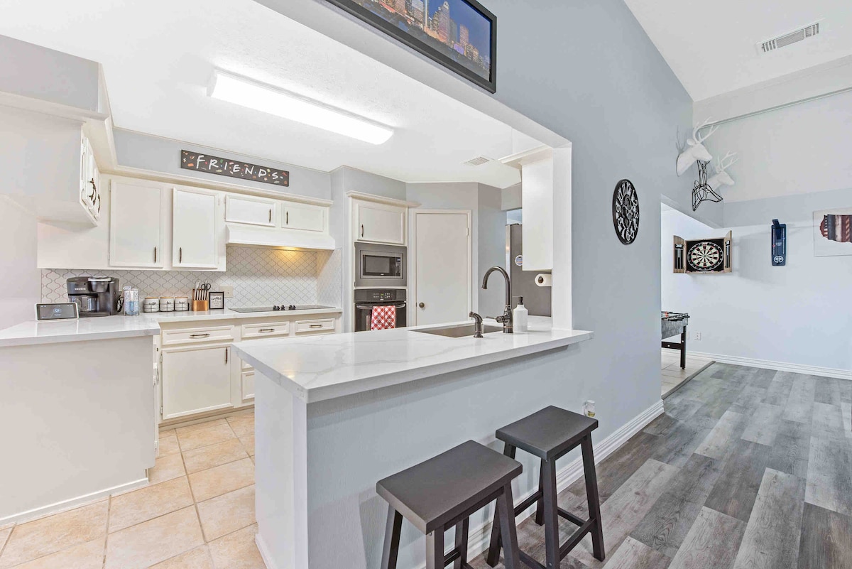 Doživite razliku u našem prilagođenom domu koji smo dizajnirali i izgradili za naše goste! 1800sf, 3 kreveta, 2 kupatila, za 14 osoba! U srcu Kineske četvrti, neposredan pristup Vestpark Tollu i Beltveju 8. Prikladno za bebe/djecu/kućne ljubimce! Sva osnovna oprema/sadržaji su uključeni: potpuno opremljena kuhinja, 2 kralja, televizori u svim sobama, vrhunska posteljina/posteljina, besplatne grickalice/pića, sve toaletne potrepštine, namenski radni prostor, mašina za pranje veša, USB priključci, ultra brzi Wi-Fi i Netflix, Hulu, Disney+, ESPN+!
