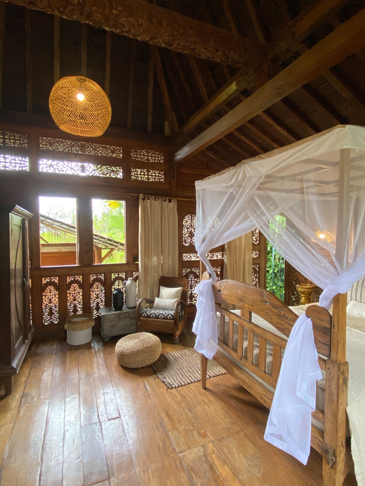*IMAMO NEVEROVATAN WI-FI (50 mbps ++) I 4 PRELEPA OBJEKTA NA LOKACIJI. KLIKNITE NA MOJ PROFIL DA BISTE VIDELI OSTALE 3 KUĆE U SLUČAJU DA JE OVA ZAUZETA TOKOM ŽELJENIH DATUMA* Da li ste ikada spavali u umetničkom delu? Od zanatlija Jave do poljoprivrednika na severnom Baliju, ovaj zapanjujući 50-godišnji ručno izrezbareni Gladak sada počiva u Sansetu Sali. Napravljen potpuno od tikovine, nokti nisu bili potrebni za rekonstrukciju ovog jedinstvenog doma - njegove ručno izrezbarene zidove vješto ukrašene zajedno.