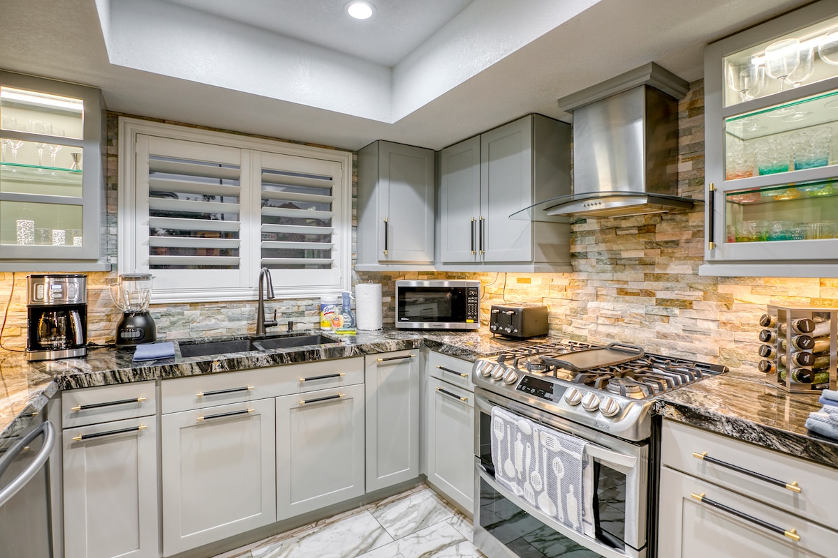 🌴 Long term visitors welcome! Private pool + spa (complimentary spa heating), cardio room, Samsung appliances, and modern upgrades throughout. Typically about 15–20 minutes to the Strip depending on traffic and destination. This 2400+ sq ft renovated home features one-of-a-kind furniture, an 8ft sparkling chandelier, marble-style flooring, and a 75-inch Samsung 4K TV! NOTE: This is NOT a party space. Please be respectful of the rules and the lovely neighbors.