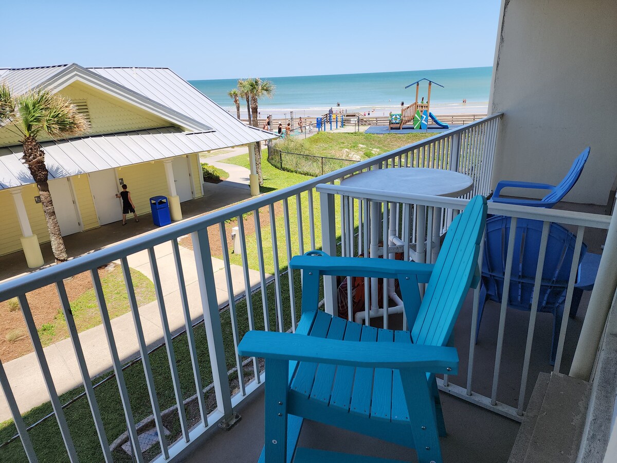 Upravo otvoreno! Dobro došli u Daytona Beach Bliss! Uživajte u našem novoobnovljenom jednosobnom stanu sa nevjerovatnim pogledom na okean sa 7. sprata. Ujutro sa balkona možete da gledate izlazak sunca, a možda čak i da ugledate delfine! Opustite se na plaži, udaljeni smo samo nekoliko koraka zahvaljujući privatnom pristupu plaži! Ili provedite neko vrijeme u grijanom bazenu i hidromasažnoj kadi na obali okeana. Peškiri za plažu, frižider, dvije stolice za plažu i suncobran su vam na raspolaganju!