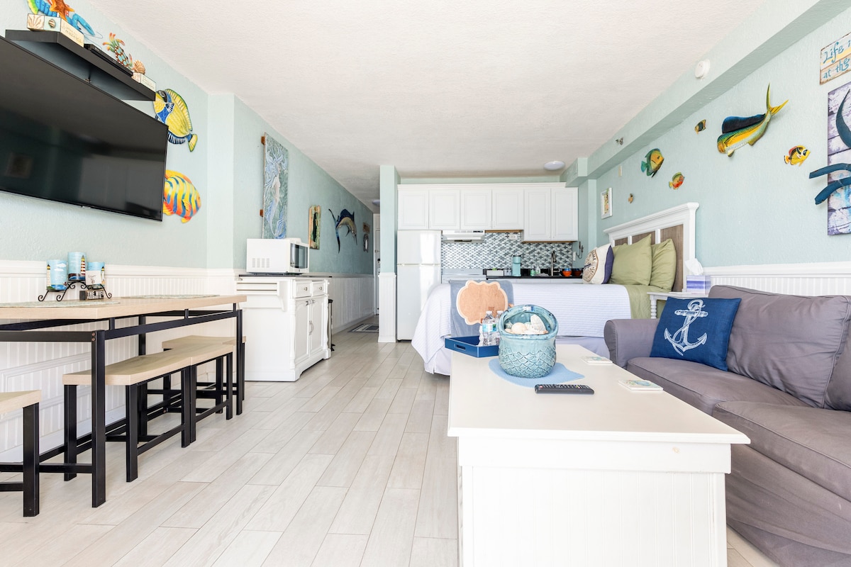 Čeka vas 🌊 vaše utočište uz okean! ✨ Uživajte u panoramskom pogledu na okean tokom boravka u ovom prelijepo uređenom studiju na obali okeana, sa novim namještajem i privatnim balkonom. Probudite se uz izlazak sunca u udobnosti svog kreveta, opustite se na kauču i uživajte u obrocima s pogledom na plažu. Potpuno opremljena čajna kuhinja, oprema za plažu i kamin za ugodnu večer. Bilo da tražite opuštanje ili avanturu, ovaj stan nudi idealno utočište pored plaže! Popusti za produženi boravak.