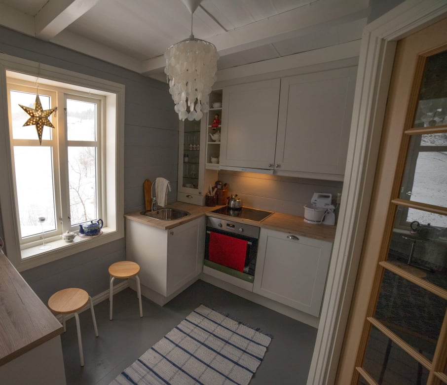 Koliba sa fantastičnim pogledom u mirnom okruženju. Blizu fjorda, a čamac za veslanje je dostupan tokom letnjeg perioda. Koliba ima čajnu kuhinju, frižider, malu rernu i mikrotalasnu. Nema mašine za pranje sudova. Kupatilo sa tušem i toaletom, grejni kablovi u podu. Dnevna soba sa garniturom, trpezarijskim stolom i udobnim kaminom. Spavaće sobe su vrlo male. Nadstrešena veranda sa baštenskim nameštajem. Posteljina i peškiri nisu uključeni. Kada pada sneg, morate parkirati pored puta i pešačiti poslednjih 50 m do kolibe. Parking pored vikendice tokom leta.