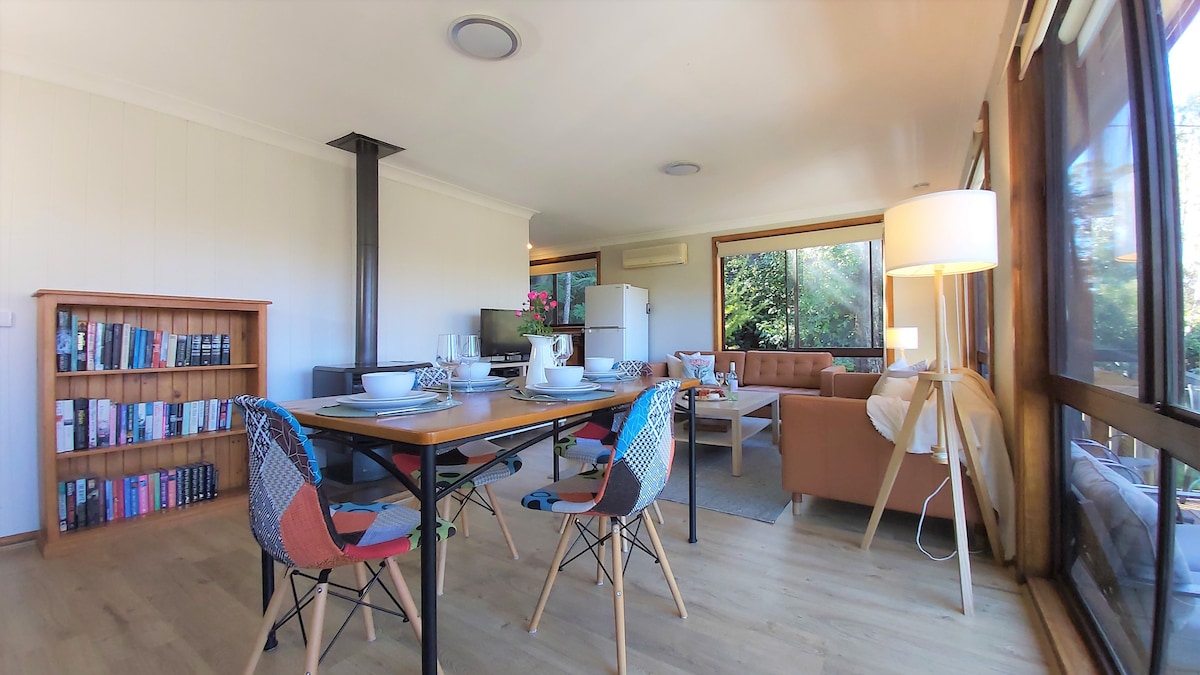 Doživite ljepotu, mir i mir u ovoj predivno uređenoj, luksuznoj seoskoj kućici za dvoje odraslih. Opustite se ispred pucketave drvene vatre uz čašu vina ili toplu šoljicu čaja. Opustite se u kadi i zaspite noću u luksuznom bračnom krevetu sa snežnom belom posteljinom. Probudite se u spektakularnom pogledu na planine i doline dok uživate u doručku gledajući kroz ogromne prozore sa slikama. Pozdravite divlje životinje, uključujući klokane i drvene patke i jednostavno „budite“.