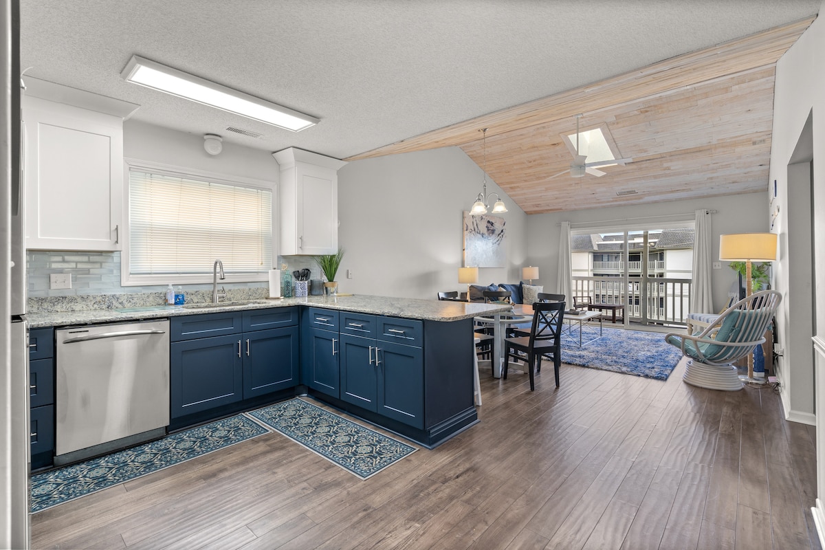 Dođite i sami uživajte u svemu što vam nudi ovaj udoban stan uz more sa svojim šarmantnim detaljima inspirisanim plažom i jednostavnim, svježim dizajnom! Jedinica se nalazi na odličnoj lokaciji unutar kompleksa, što omogućava mirniji odmor od zajedničkih prostora, ali nije previše udaljena da biste mogli da uživate u njima. Neverovatan pogled sa balkona do kojeg se može doći i iz glavne spavaće sobe i iz glavnog stambenog prostora. Nedavno smo ažurirali kuhinjske aparate! Nedeljni najam sub–sub 15.5–1.9.