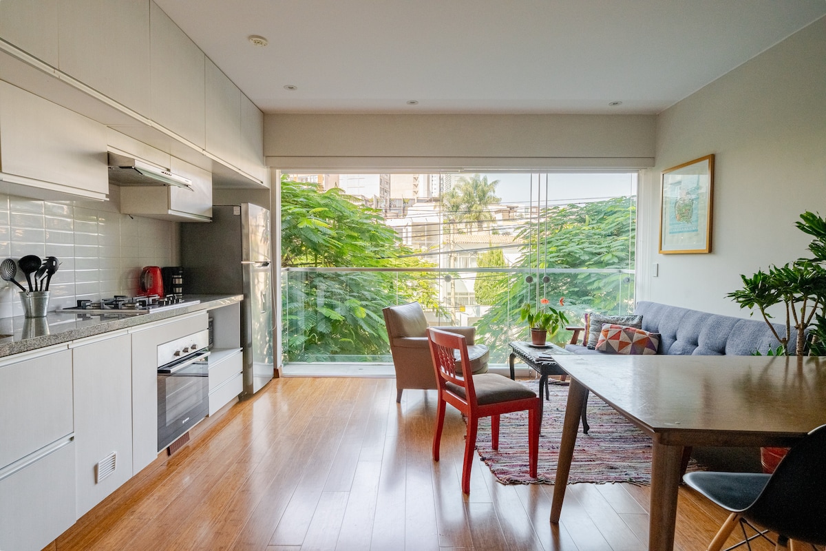 Dobro došli u ovo moderno i udobno potkrovlje u okrugu Barranco granice sa Mirafloresom. Nalazi se u blizini šetališta koja povezuje najturističkije i najatraktivnije četvrti u Limi. Idealno za turiste i poslovne putnike. Uživajte u elegantnom doživljaju u ovom centralnom domu.
