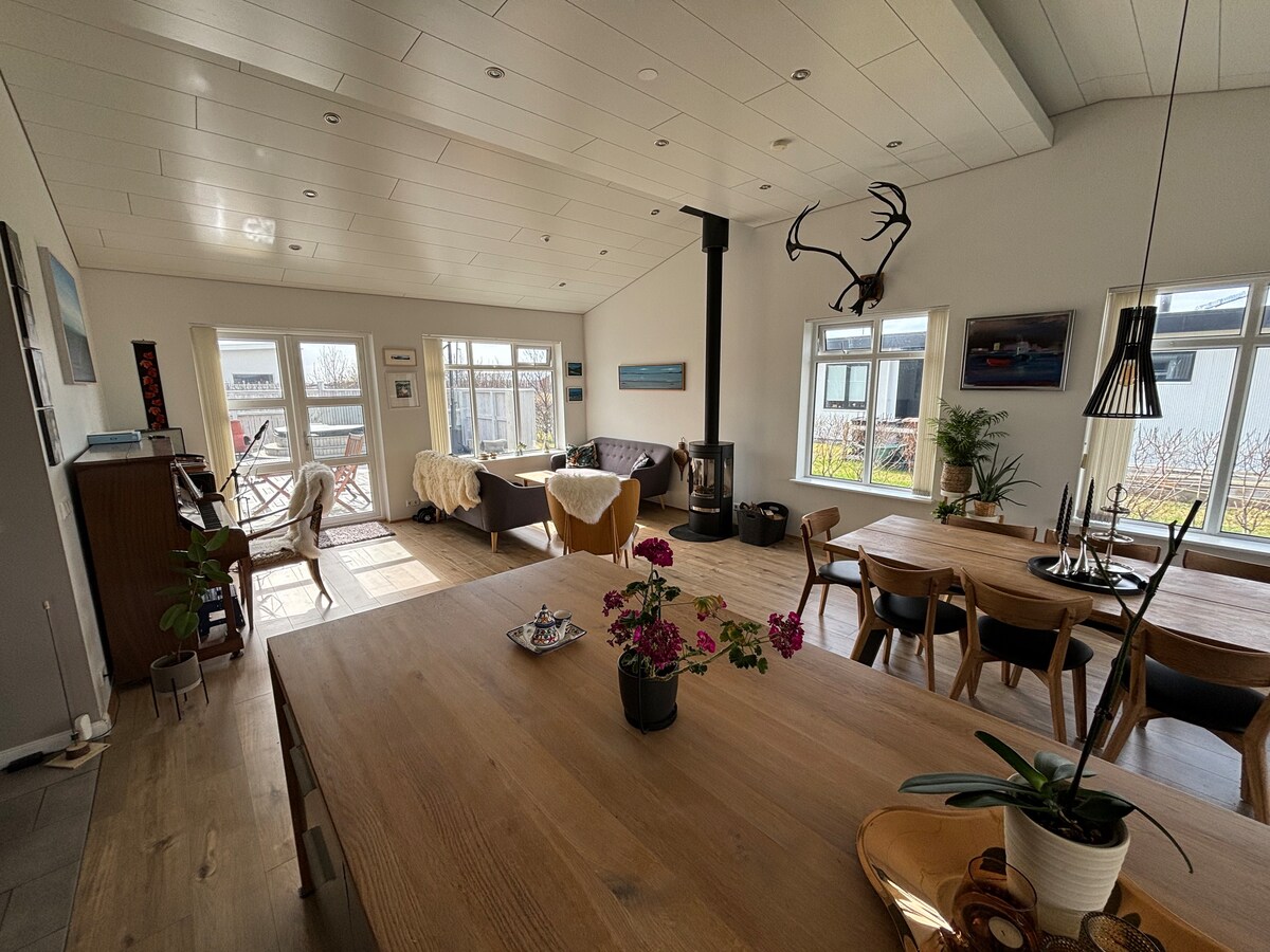 Stan za goste sa potpuno novom konstrukcijom, svetlim i modernim skandinavskim dizajnom. Stan ima sve što vam treba za udoban boravak, uključujući potpuno opremljenu kuhinju, kupatilo sa kišnim tušem, spavaću sobu 1 sa velikim bračnim krevetom i spavaću sobu 2 sa dva kreveta za jednu osobu. U dnevnom boravku nalazi se trpezarija za 6 osoba i dva kauča, koji se lako menjaju u bračne krevete. Samo nekoliko koraka od mora i staze uz obalu koja se proteže dužinom starog ribarskog sela Eyrarbakki.