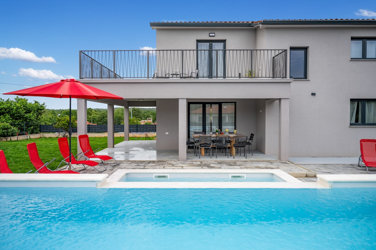 Dobro došli u našu modernu novu vilu u Labinu u Istri! Sa 4 spavaće sobe, 3 kupatila, 1 WC za goste, potpuno opremljenom kuhinjom, dnevnim boravkom i trpezarijom, privatnim bazenom, baštom sa prostorom za igru, Wi-Fi, klima uređajem, mašinom za pranje veša. Nalazi se u mirnom rezidencijalnom dijelu, supermarketi, restorani u krugu od 1 km, plaža Rabac za 15 minuta, stari grad Labin za 10 minuta. Savršeno za porodice ili grupe prijatelja.