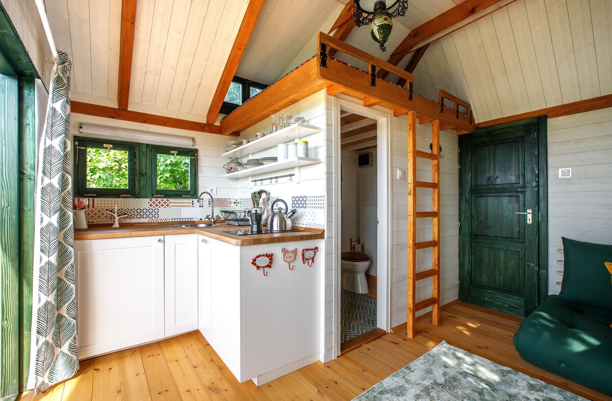 Najpopularniji boravak u Dióligetu je ljubavno gnijezdo ispod lišća džinovskog hrasta. Mala zelena vrata između hrastovog spoja su seoska kuća sa udobnošću. Takođe ima opremljenu kuhinju i kupatilo sa tuš kabinom sa WC šoljom. Sa terase iznad možete čak i da se opustite u stolici za ljuljanje i divite se panoramskom pogledu na planine Vertes ili veličanstveno zvjezdano nebo, a viseća ležaljka za dvije osobe na terasi ispod kolibe privlači vas za malo romantičnog maženja.