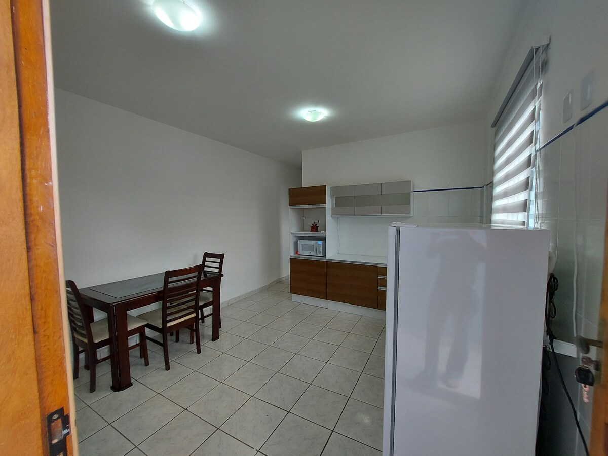 Gostinjska kuća površine 40m² i svom osnovnom opremom koja vam je potrebna za ugodan boravak. Velika spavaća soba sa bračnim krevetom, noćnim ormarićem, garderobom i digitalnim pametnim TV-om; kupatilo sa električnim tušem; kuhinja sa plinskim šporetom, mikrotalasnom rernom i priborom; soba američkog tipa u kojoj možete da koristite za obroke, pa čak i za posao. Nema garaže. Udaljeni smo 1,4 km od autoputa, obližnjih pijaca i 2,5 km od tržnog centra Taboão.