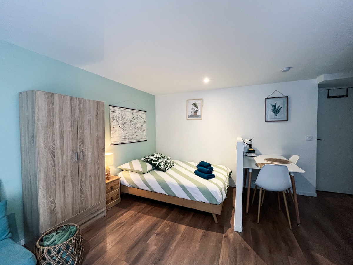 Za vaš turistički ili profesionalni boravak, dođite i uživajte u potpuno renoviranom novom smještaju u prirodnom stilu 500 m od željezničke stanice Tain l 'Ermitaž i u podnožju vinograda Crozes l' Ermitaž, Svetog Džozefa i drugih naziva. Ima kuhinju sa staklom, ploču za kuvanje, rernu, gornji frižider, zeleno kupatilo sa duplim umivaonikom, veliku tuš-kabinu i viseću WC šolju. Dnevni boravak sa foteljom i TV-om. Wi-Fi . Vrhunska spavaća soba i posteljina u 160 prirodnih boja i vode zelene boje.