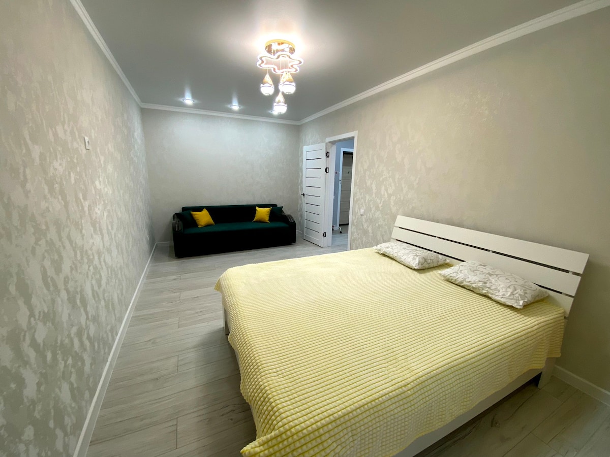 Квартира расположена в удобном районе города, в новом доме. К услугам гостей бесплатный Wi-Fi. В числе удобств полностью оборудованная кухня, ванная комната, спальня. В апартаментах установлены стиральная машина, большой смарт-телевизор. В ближайшей доступности продуктовые магазины Кристалл, Лайм, спортивный комплекс Бурабай.