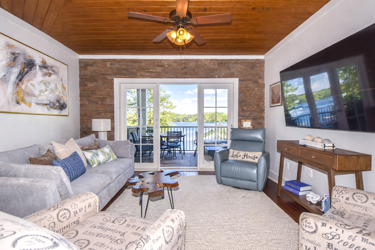 Novi smeštaj sa 5 zvezdica! Uživajte u elegantnom iskustvu u ovom centralno lociranom smještaju s imanjem na obali 278 stopa, nadsvođenim dnevnim boravkom i trpezarijskim prostorom sa kaminom otvorenim prema kuhinji i ekranom na tremu. 4 spavaće sobe, 2 bračna kreveta, 1 bračni krevet i 1 spavaća soba (2 puna i2 XL blizanca) sa svim profesionalnim aparatima, ogromnim ostrvom i 2 frižidera (drugi frižider u vešu). Pametni televizori, besplatan Wi-Fi, zvučni sistem u kući. Plutajući dok, na zahtev, ognjište, kanu i daska za veslanje