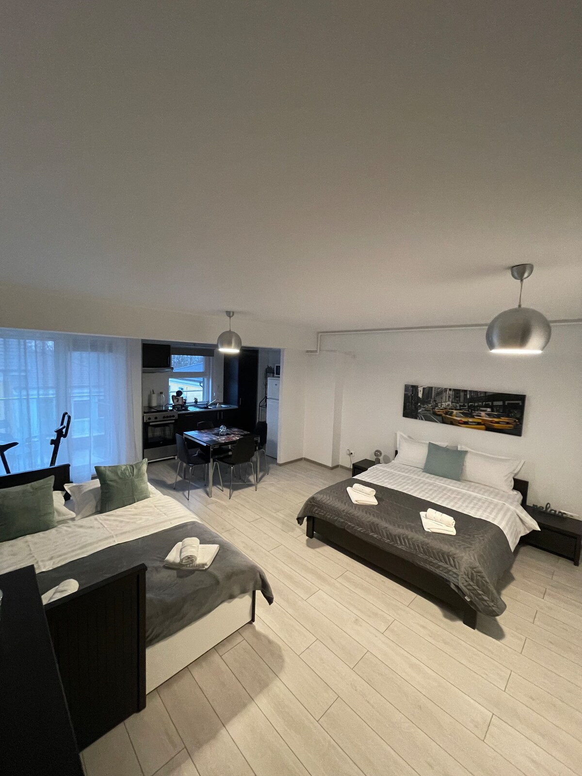 Zdravo! Moje ime je Danijela i obezbeđujem vam kompletno opremljen, elegantan studio. Ostatak i dnevni prostor su ograničeni, kao što se vidi na fotografijama. Tu su bračni krevet i kauč na razvlačenje. Studio je takođe opremljen televizorom sa ravnim ekranom i potpuno opremljenom kuhinjom, koja gostima nudi šporet, mikrotalasnu rernu, frižider i mašinu za pranje veša u kupatilu. Udaljen je samo 1 km od aerodroma Otopeni. Nadam se da se osećate odlično! 😀