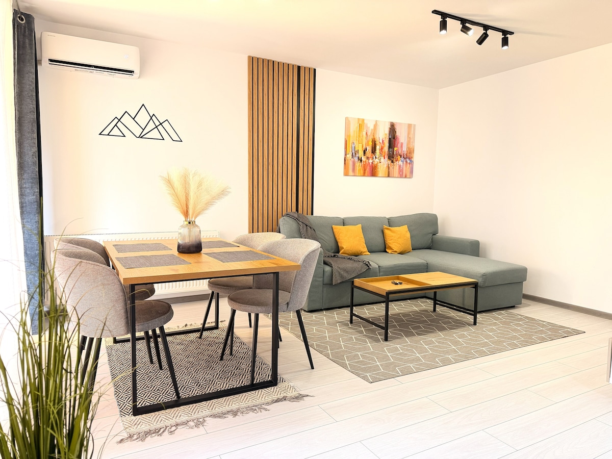 Ultramoderni potpuno opremljeni apartman sa privatnim parkingom i elektronskom bravom za prijavu/odjavu. Nalazi se u potpuno novom stambenom području – Cartier Coresi, u blizini tržnog centra Coresi, na 10 minuta od istorijskog centra. Ima spavaću sobu sa bračnim krevetom, dnevni boravak sa sofom na razvlačenje, potpuno opremljenu kuhinju, klima-uređaj, veliku terasu sa ležaljkom, mašinu za pranje veša/mašinu za pranje sudova, dva 4k televizora sa Netflix-om i HBO Go-om.