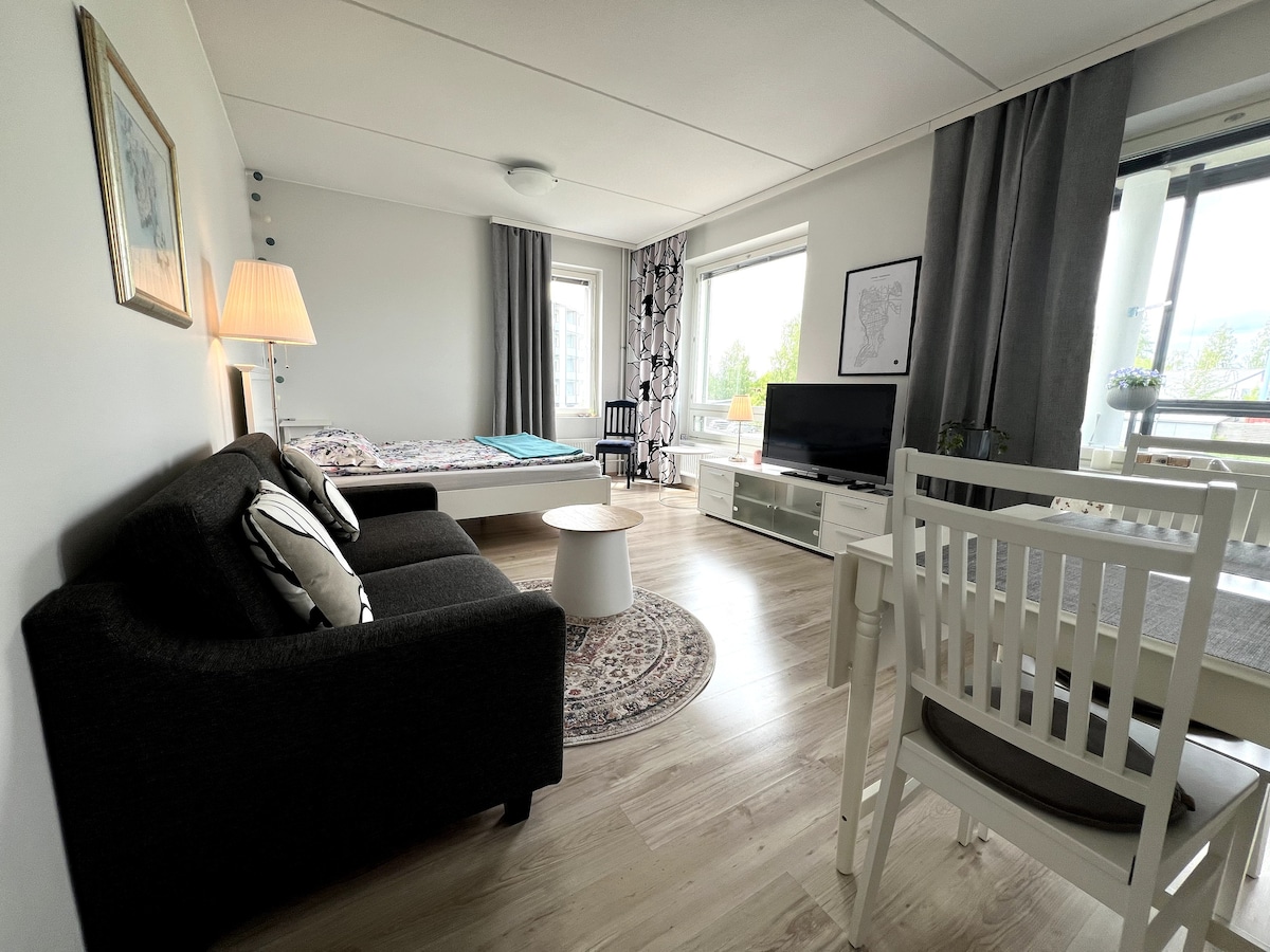 Elegantan stan s pogledom na Näsijärvi u blizini centra Tamperea. Moderan stan ima sve što vam treba za kratkoročni život. Pored parkova, pješačkih staza i šetališta, mjesta za plivanje. Atmosfera u okolini je opuštena i jedinstvena. Područje je okruženo prekrasnom vodenom površinom, Särkänniemi, a centar grada je u neposrednoj blizini. Bračni krevet u spavaćoj sobi, sklopivi dušeci i/ili dušek na naduvavanje u dnevnoj sobi ako je potrebno, uključujući krevet za kampovanje za bebe.