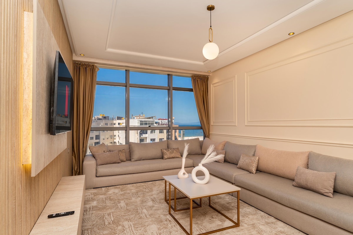 Vous êtes à la recherche d'un appartement moins cher qu'un hôtel. Découvrez cet appartement luxueux en plein centre-ville de Tanger et avec vue partielle sur mer, à 2 min de Marina ,près des cafés et boutiques ,du Mall Ibn Batouta ,de l'ancienne médina et monuments historiques .Le point de départ idéal pour explorer la ville. Cet élégant appartement d'une chambre, un salon ,une terrasse vue mer ,une cuisine américaine , un climatiseur , une WIFI , ( espace de travail ) , smart TV .