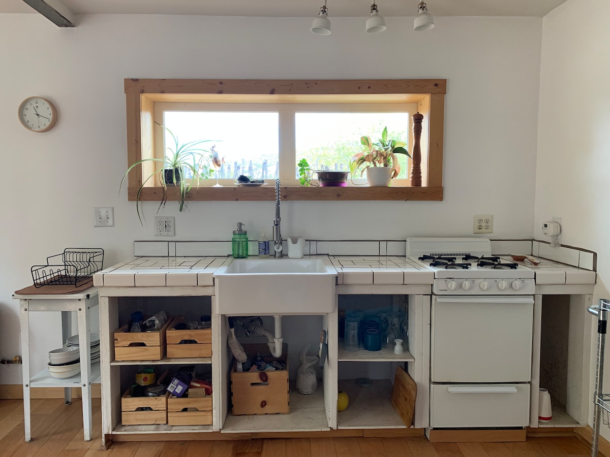 Very bright 2 bedroom, 1 bath. Lots of skylights. Fully furnished. Queen bed. 2nd bedroom is set up as a workspace. High speed internet. Well equipped kitchen. Full bathroom. Washer and dryer. Fenced in patio. Vented gas potbelly stove. Flat screen TV in living room and bedroom. Walk to plaza and organic grocery store. Big shade trees. Quiet, rural neighborhood only 5 minutes from plaza. No chemically scented products used. All natural fiber bedding. Organic chemical free mattress.