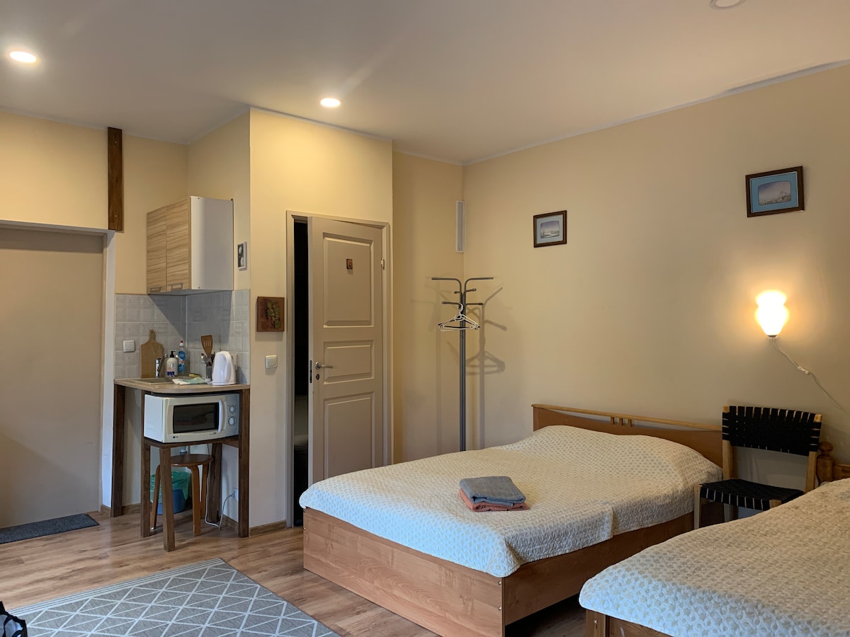 Ovaj prostrani stan (57 m2) ima veliki dnevni boravak i dve spavaće sobe sa visokim plafonima. Toplo je i udobno sa dva grejača na drva. Nalazi se u staroj drvenoj kući, smještenoj u centru u mirnom dvorištu, na 10 minuta ležerne šetnje od Trga gradske vijećnice.