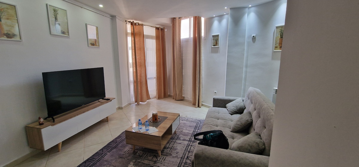 Udoban stan u Coeur de Tizi-Ouzou. Prostranih 100 m2, idealno za 4 osobe sa 2 spavaće sobe (1 bračni krevet, 2 kreveta za jednu osobu), udobnim dnevnim boravkom, opremljenom kuhinjom i modernim kupatilom. Nalazi se na 3. spratu (bez lifta), na 5 minuta od centra novog grada i 10 minuta od željezničke stanice. Minimalistički stil, veoma čist, sa prijatnim pogledom na izlaz iz grada. Uključen je Wi-Fi, klima-uređaj i mašina za pranje veša. Fleksibilna prijava od 15:00, odjava prije 11:00. Zabranjeno pušenje, kućni ljubimci nisu dozvoljeni. Dostupan je IPTV