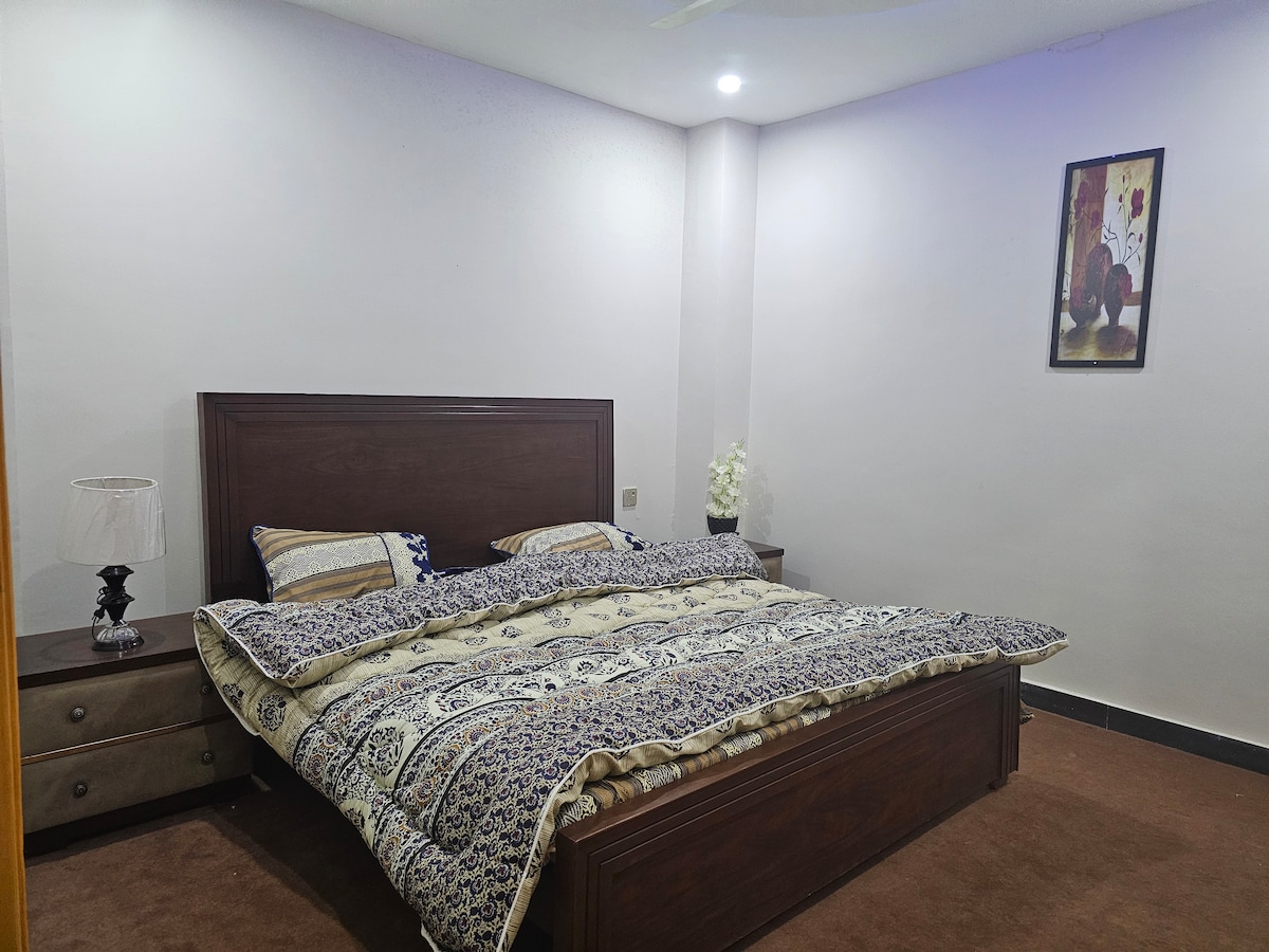 Dobro došli u naše elegantne dvosobne apartmane u DHA 5 Islamabad. Uživajte u pogodnostima brze vožnje od/do posla i opustite se u prostoru s lijepim dekorom i potpuno opremljenim kućnim bioskopom. Idealno za putnike koji traže udobnost i zabavu, ovaj udoban smještaj nudi moderne sadržaje na vrhunskoj lokaciji. To je potpuno zaseban dio sa zasebnim ulazom i parkingom, prikladan za porodice, stoga vrlo siguran i miran. Zabave i glasna muzika nijesu dozvoljeni. Neudati parovi nisu dozvoljeni.