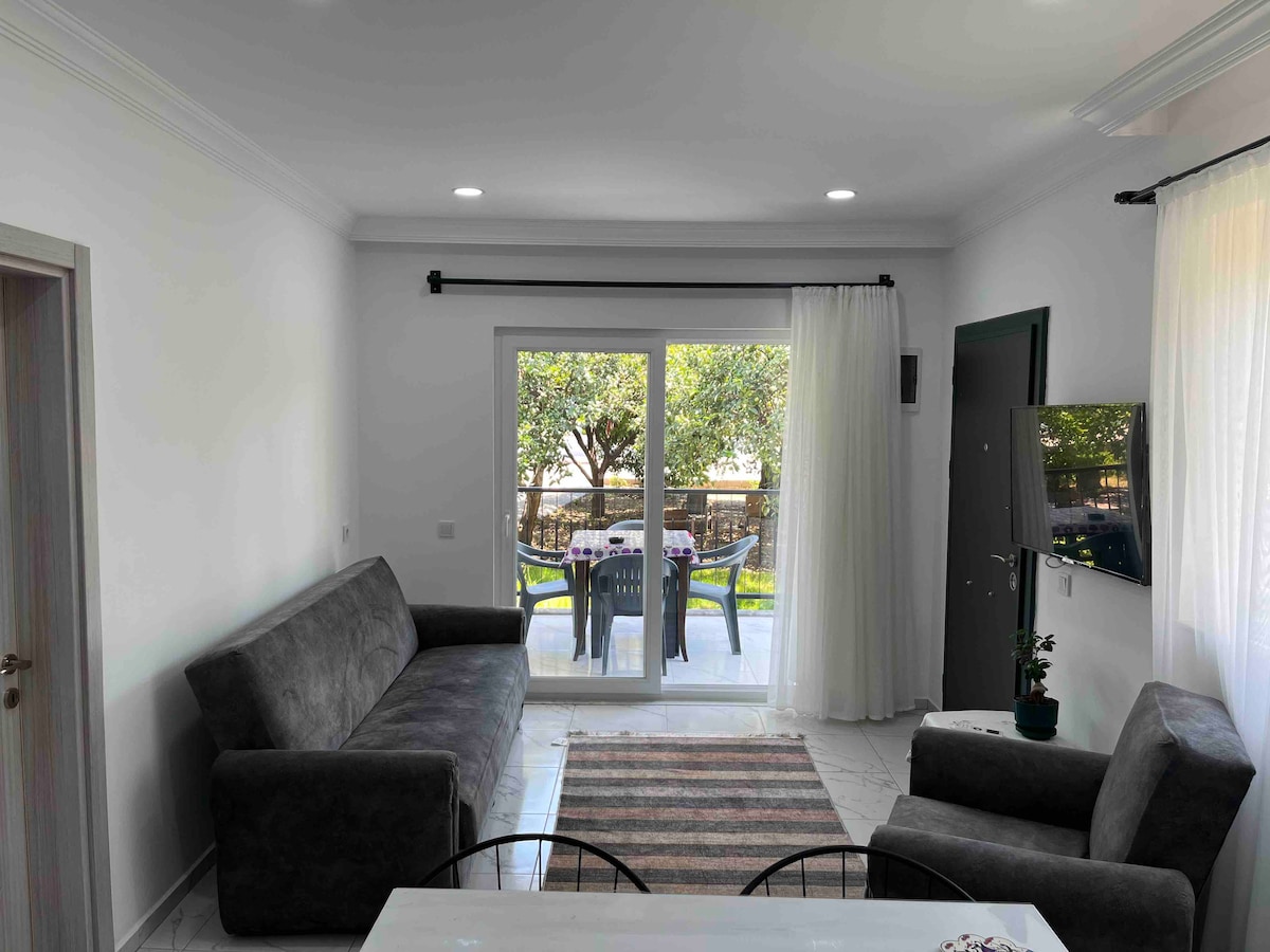 Naš apartman je 2+1 i ima 2 velika balkona. Nudimo vam udoban odmor sa 2 spavaće sobe sa 1 bračnim krevetom i 2 krevetima za jednu osobu i dnevnim boravkom sa velikim prostorom za sedenje. Pružamo potpunu udobnost kao kod kuće sa klima uređajem, Smart TV-om, mašinom za pranje veša, frižiderom i svim potrebnim kuhinjskim priborom. U našoj prostranoj bašti možete uživati u mirnim letnjim mesecima ispod stabala pomorandže i mandarine.