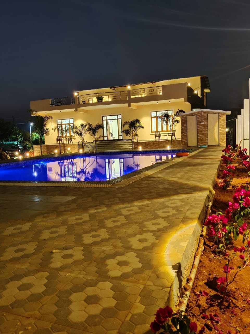 Prostrana, elegantno dizajnirana dupleks vila na farmi prelijepo spaja rustični šarm sa modernom sofisticiranošću. Ima 4 potpuno opremljene spavaće sobe sa kupatilom, blistav bazen, bujni zeleni travnjak, dečiji prostor za igru, kriket za odrasle i još mnogo toga što nudi vrhunsku udobnost i opuštanje. Napomena: Konzumiranje alkohola je strogo zabranjeno u seoskoj kući.