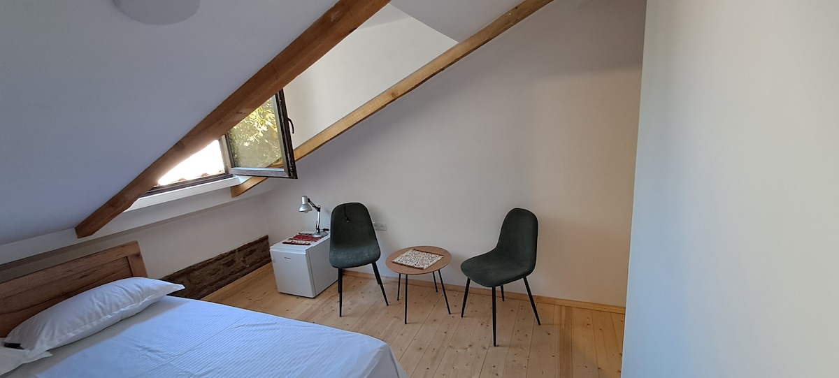 Kick back and relax in this calm, stylish space. This guesthouse is run by Gocha and his wife Nino, a warm and creative couple known for their hospitality. Gocha is highly skilled in crafting, and the entire home is decorated with unique handmade pieces, created by him. Every detail has its own story and adds character to the space. One of the most unforgettable features? A small cable-car food delivery that brings meals directly to the terrace — a charming touch guests always remember.