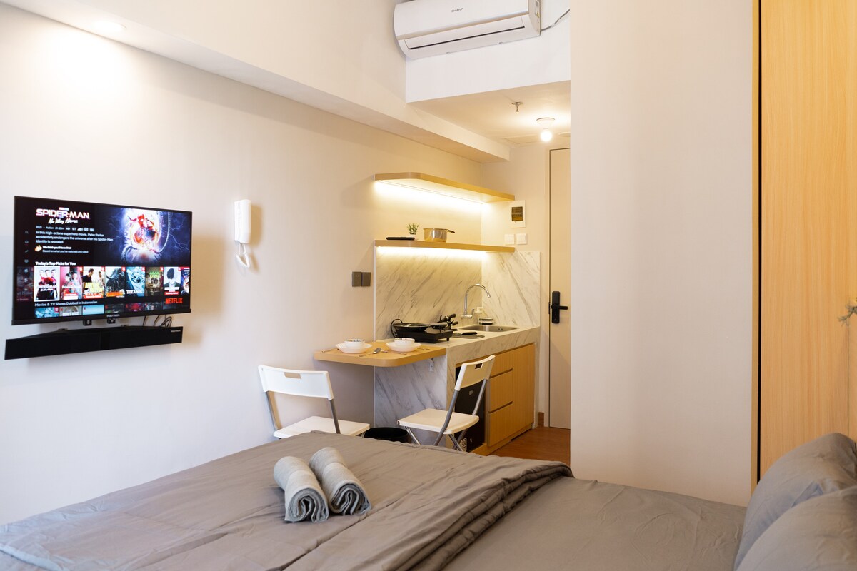 Our apartment is brand new and decorated minimally for comfort. We accept longer stay (weekly/monthly) at a special rate, inquiry with us! Room details : - Queen bed size 160 x 200 - Smart TV for Netflix chill - Working table - NON SMOKING, if you SMOKE, we charge IDR 1.000.000 to clean up