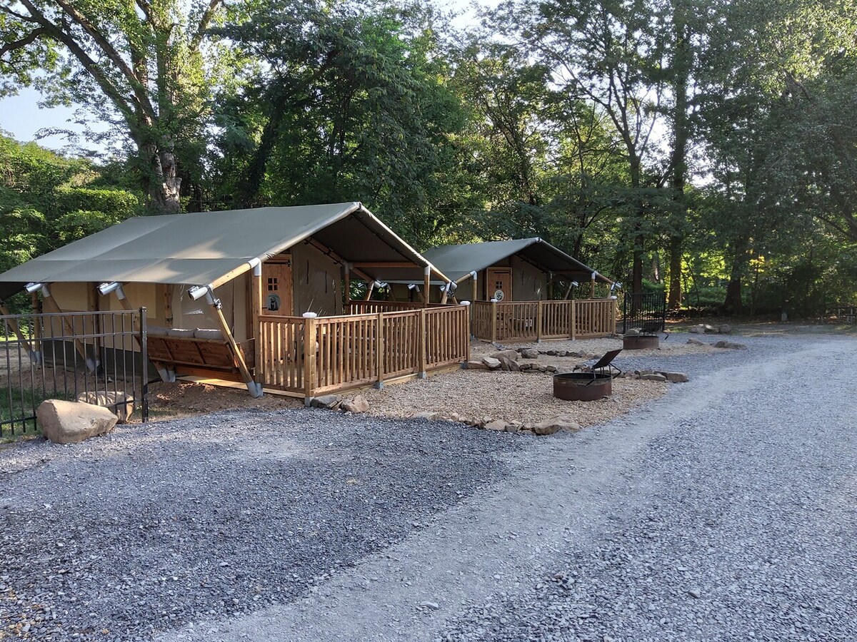 Odsjednite u našem ručno izrađenom šatoru za glampovanje, izgrađenom od tradicionalne drvene stolarije i umotan u ljepotu i hirovitost prozračnog pamučnog platna. Udahnite. Približite se. Budite mirni. Posmatrajte jutarnju maglu kako pluta kroz dolinu sa vašeg trijema. Odspavajte dok sunčeva svjetlost pleše preko platna. Uživajte u zvucima pjevanja ptica i povjetarca dok čitate dobru knjigu. Avanture U blizini: 15 minuta – indijski park Mtn. 40 minuta – Noris Lejk 45 minuta – Kamberland Fols 2 sata – Great Smoky Mtn. Ntl. Park