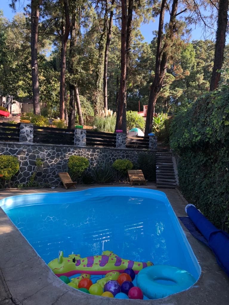 Naša kuća ima veoma bogatu atmosferu. Imamo četiri prostrane sobe sa kupatilom i sopstvenim kupatilom. S pogledom na veliku baštu sa bazenom. Postoje igre za decu koje čuvamo i uživamo dve generacije. Bašta ima veoma važno drveće za nas i predstavlja naše velike ljubavi. Područje je veoma tiho i bezbedno. Udaljeni smo 10 minuta automobilom od centra Tepoztlana. Pogled na planinu Tepozteco utiče na zemljište površine 4.000 m2.