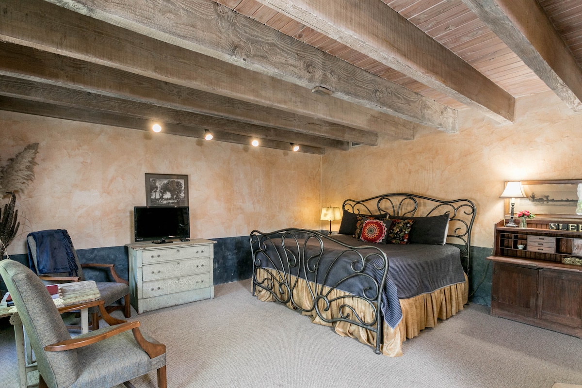 One of five accommodations on the property, El Jefe's Casa is an impressive two-story structure that is sure to captivate. The first floor includes an inviting king bed, dining area for two, and a half bath. Upstairs, you'll be impressed by a whirlpool tub, makeup station, and french doors leading to a small balcony. El Jefe's is also conveniently located just 1 block north of Main Street, so many attractions are within walking distance.
