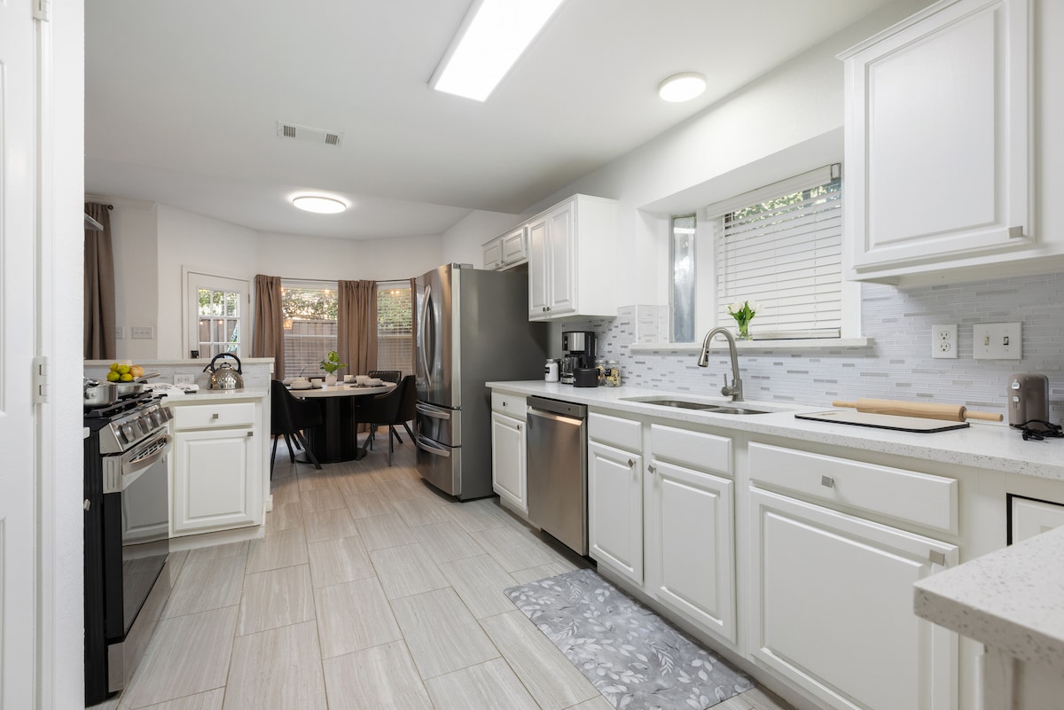 Opustite se u privatnom bazenu nakon istraživanja naselja Legacy West, a zatim pripremite večeru na roštilju pod teksaškim nebom. Ovaj prostrani smještaj u Planu savršen je za porodice, poslovne putnike i radnike na daljinu. Dom na centralnoj lokaciji. Tržni centar i restorani Legacy West udaljeni su samo 10 minuta! U glavnoj spavaćoj sobi se nalazi ukupno 6 kreveta za jednu osobu i jedan veliki bračni krevet. To je savršen porodični prostor u kojem svi mogu da uživaju u udobnosti i privatnosti, ali i u porodičnom vremenu, sve u jednom domu.