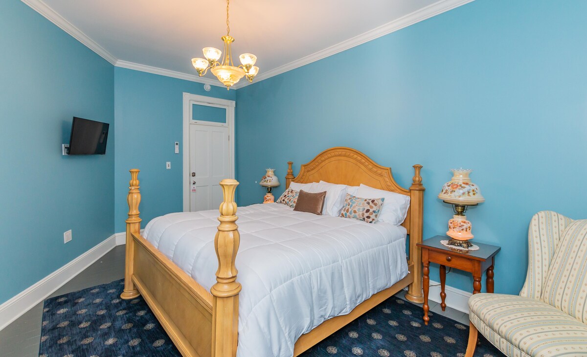 Deluxe King apartman sa balkonom i dnevnim boravkom u našem novouređenom istorijskom prenoćištu. Bračni krevet (širine 180-220 cm) i kauč na razvlačenje. Ova jedinica ima 1 kupatilo sa dvostrukim umivaonikom i 1 pola kupatila. Soba ima peškire, toalet papir, šampon, regenerator, losion za telo i druge toaletne potrepštine. Široki balkon ima bistro za uživanje u kafi ili srećnom satu. Ova jedinica ima i mini frižider i aparat za kafu Keurig. Obezbeđujemo K-šalice, čaj, šećere i razne grickalice. Gostinjska soba 1 nije prikladna za kućne ljubimce.