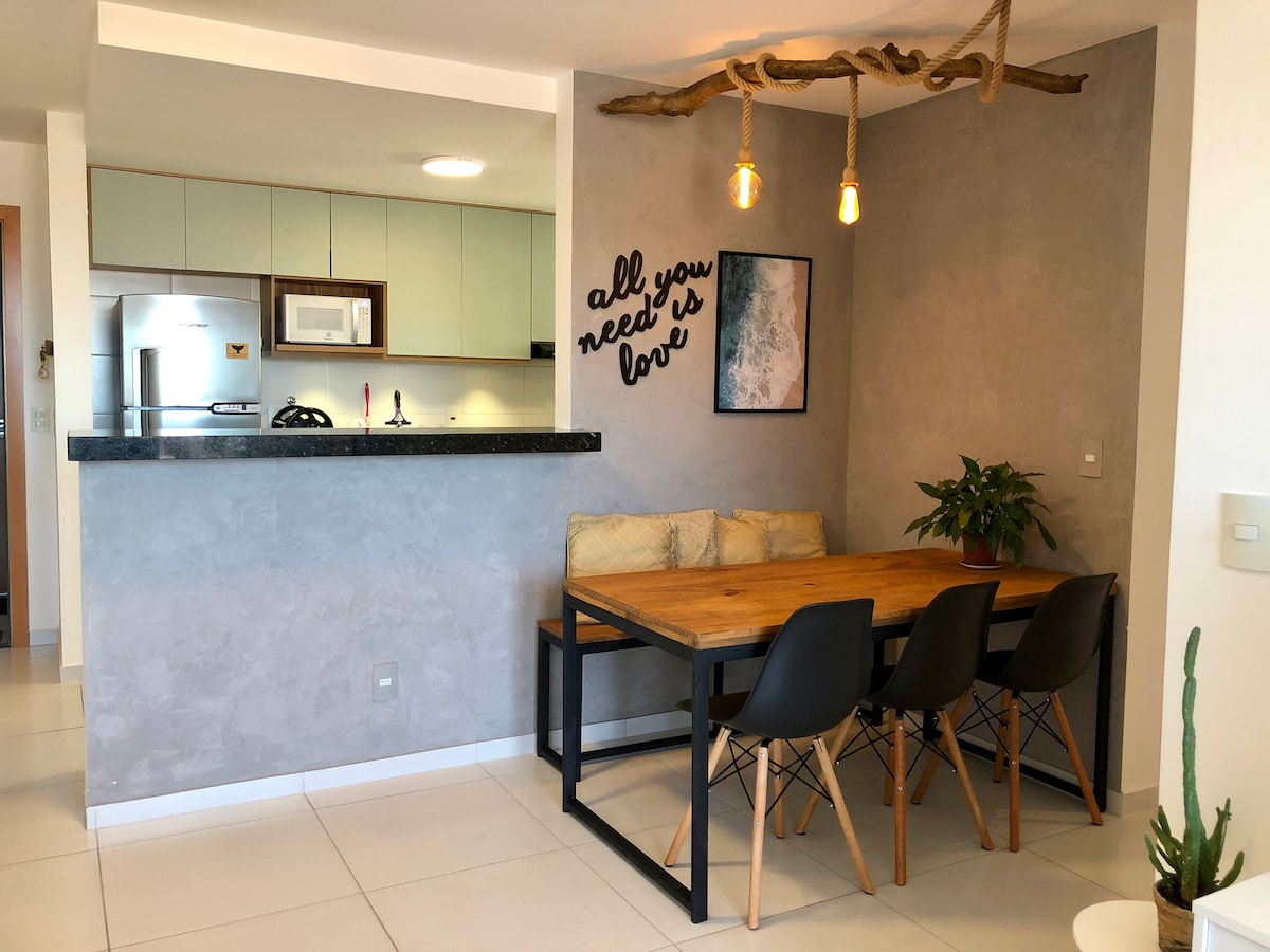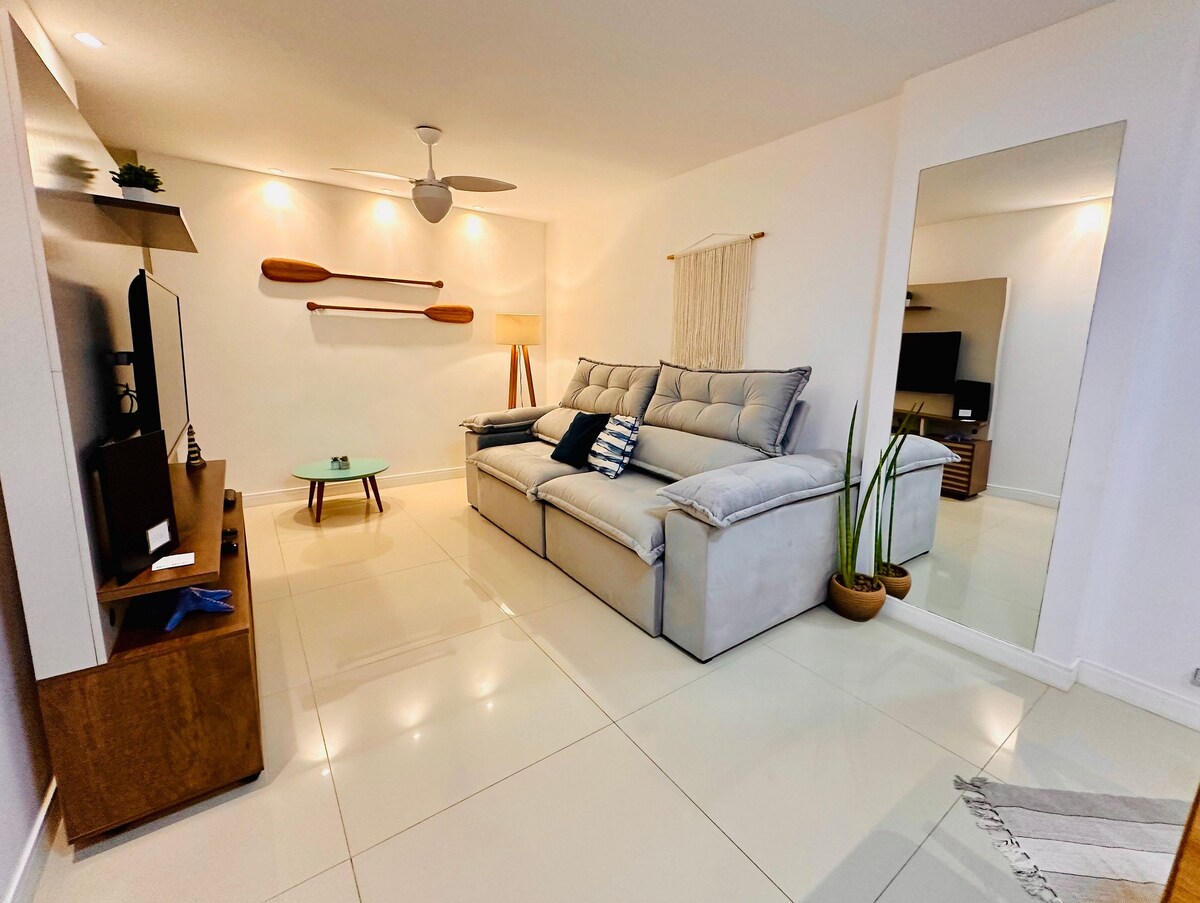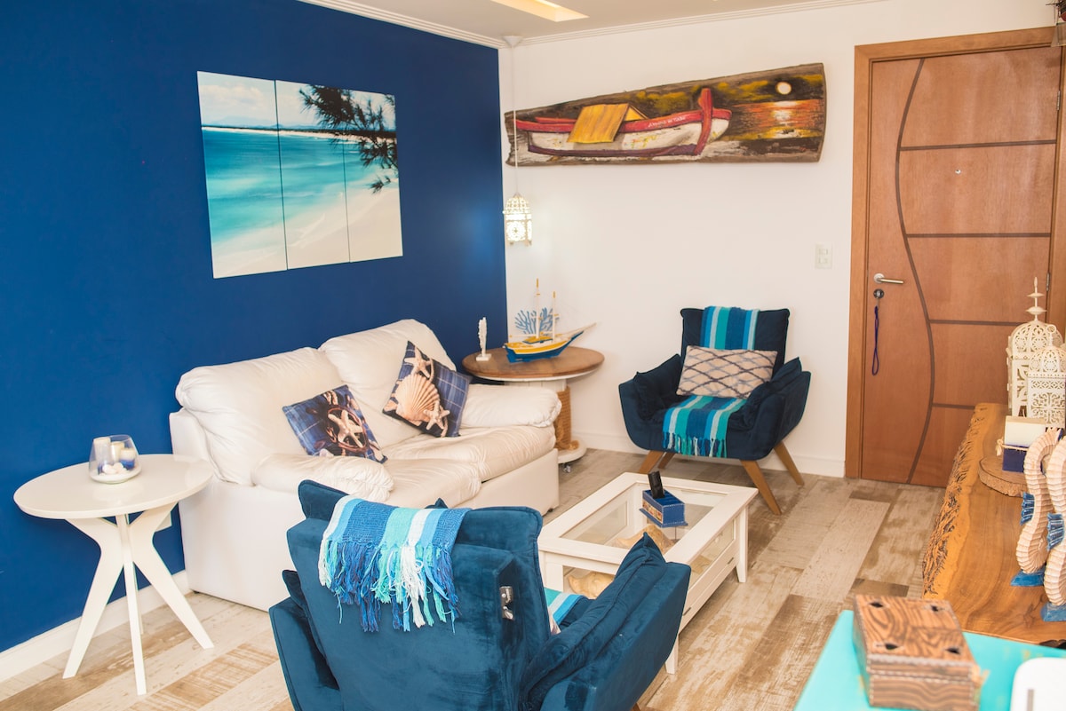 Apartman sa 2 klimatizovane spavaće sobe, integrisan sa opremljenom kuhinjom i privatnim roštiljem. Udobnost i opuštanje uz prekrasan pogled na more. Idealno za porodice, parove ili prijatelje koji traže praktičnost i posebne trenutke u blizini plaže, sa pijacama i restoranima u blizini. Wi-Fi vam je na raspolaganju. Naš kondominijum ima bazen za odrasle i decu, igraonicu, biblioteku igračaka i suve i parne saune. Imamo i parking mjesto.