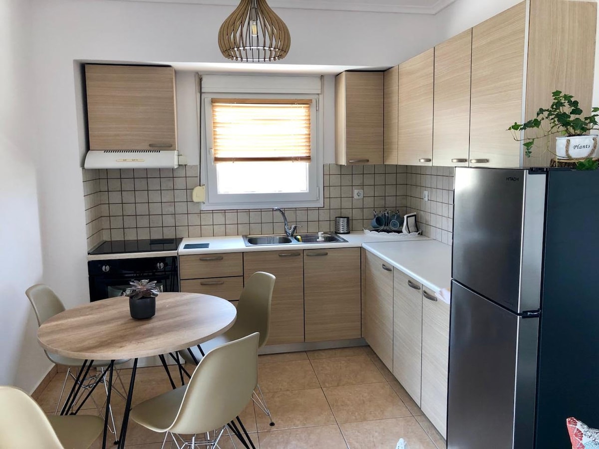 Jedinstven stan s 3 spavaće sobe i pogledom na more u Aja Triadi. Divno je, bilo da dolazite na odmor ili poslovno. Potpuno je opremljen svim sadržajima koje moderni gost traži. Uživajte u plivanju ispred kuće. Mnoge opcije restorana, ribljih taverni, barova, barova na plaži, kafe, brze hrane itd. Uživajte u jutarnjoj kafi ili čaši vina u večernjim satima na terasi s pogledom na more ili planinu.