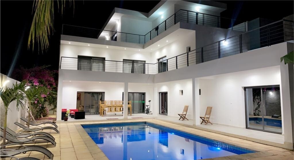 Luksuzna vila od 1500 m2 sa 4 spavaće sobe sa kupatilima i privatnim toaletima. Klimatizovane spavaće sobe i dnevna soba. Bazen sa bazenom za veslanje, 11 m x 5 m, filter sa solarnom energijom. Vrlo prozračna terasa od 86 m2 opremljena plafonskim svetlom,dnevnim boravkom i trpezarijskim stolom na otvorenom. Kuća se nalazi u blizini centra za opuštanje, morske krave i 8 minuta hoda od plaže. Struja se naplaćuje: 160 FCFA / Kwt(0,26 ventilacija) Generator .