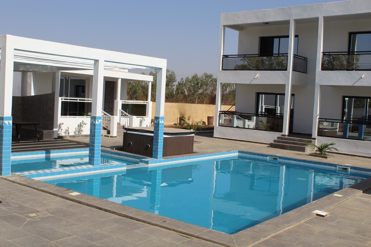 🌟 Séjour confortable avec piscine privée à Thiès Profitez d’un séjour agréable dans cet appartement spacieux, idéal pour les familles, les voyageurs ou les séjours professionnels. 🏊♀️ Piscine privée pour vos moments de détente en toute intimité. ❄️ Climatisation pour un confort optimal 🔒 Logement sécurisé situé dans un quartier calme 📍 À proximité du centre-ville et à environ 20 minutes de l’aéroport