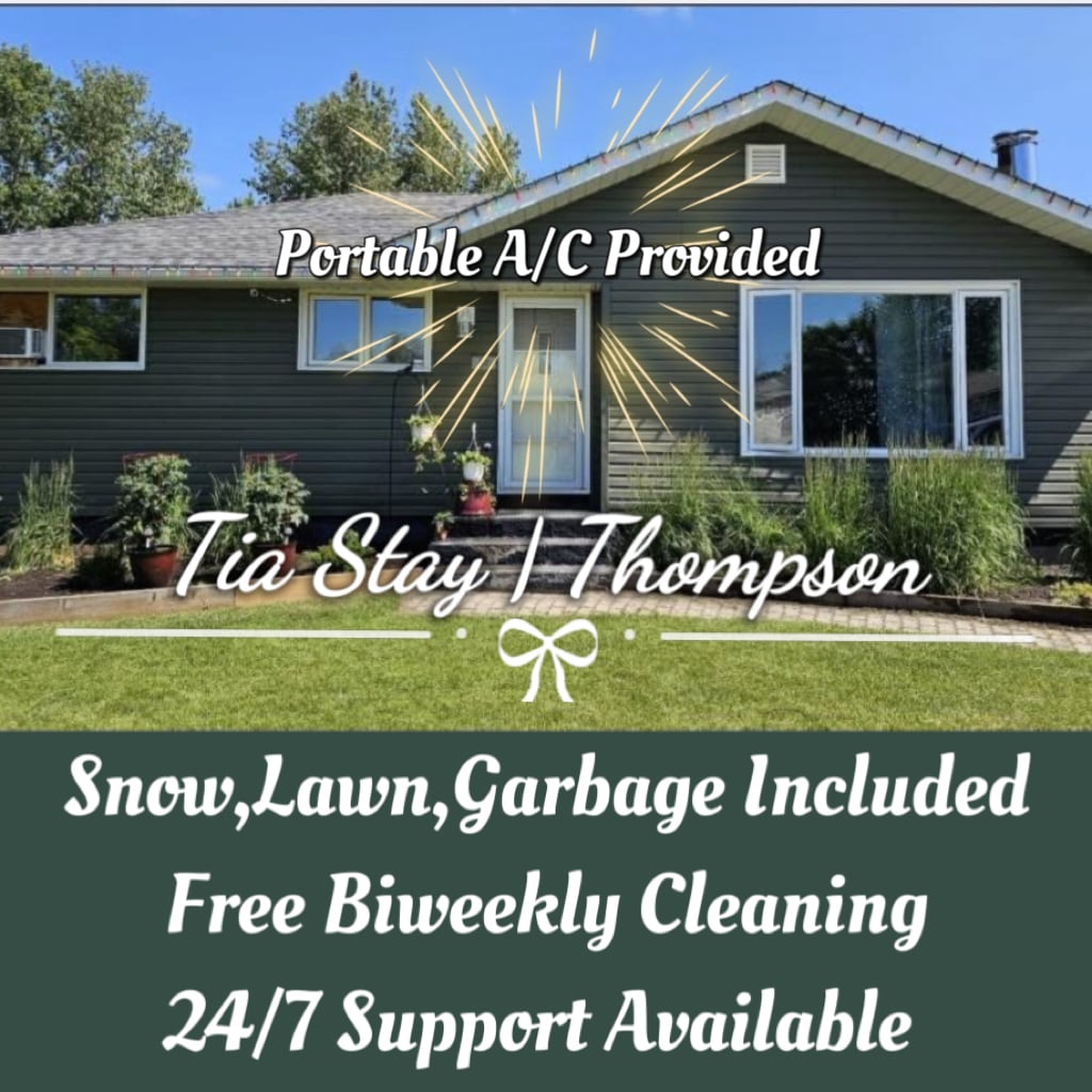 Boravite u udobnom bungalovu s četiri spavaće sobe i tri kupatila u tihom i bezbjednom dijelu grada Tompsona. Uživajte u kompletnoj teretani sa okružujućim zvukom, udobnoj sobi za zabavu sa barom i tri velika TV ekrana. Opustite se na terasi uz roštilj Broil King ili se opustite pored ognjišta u dvorištu. Uz mnoštvo parking mjesta i jednostavan pristup lokalnim sadržajima, ovaj smještaj je idealan za porodice, radne ekipe ili svakoga ko traži čist i praktičan smještaj u sjevernoj Manitobi.
