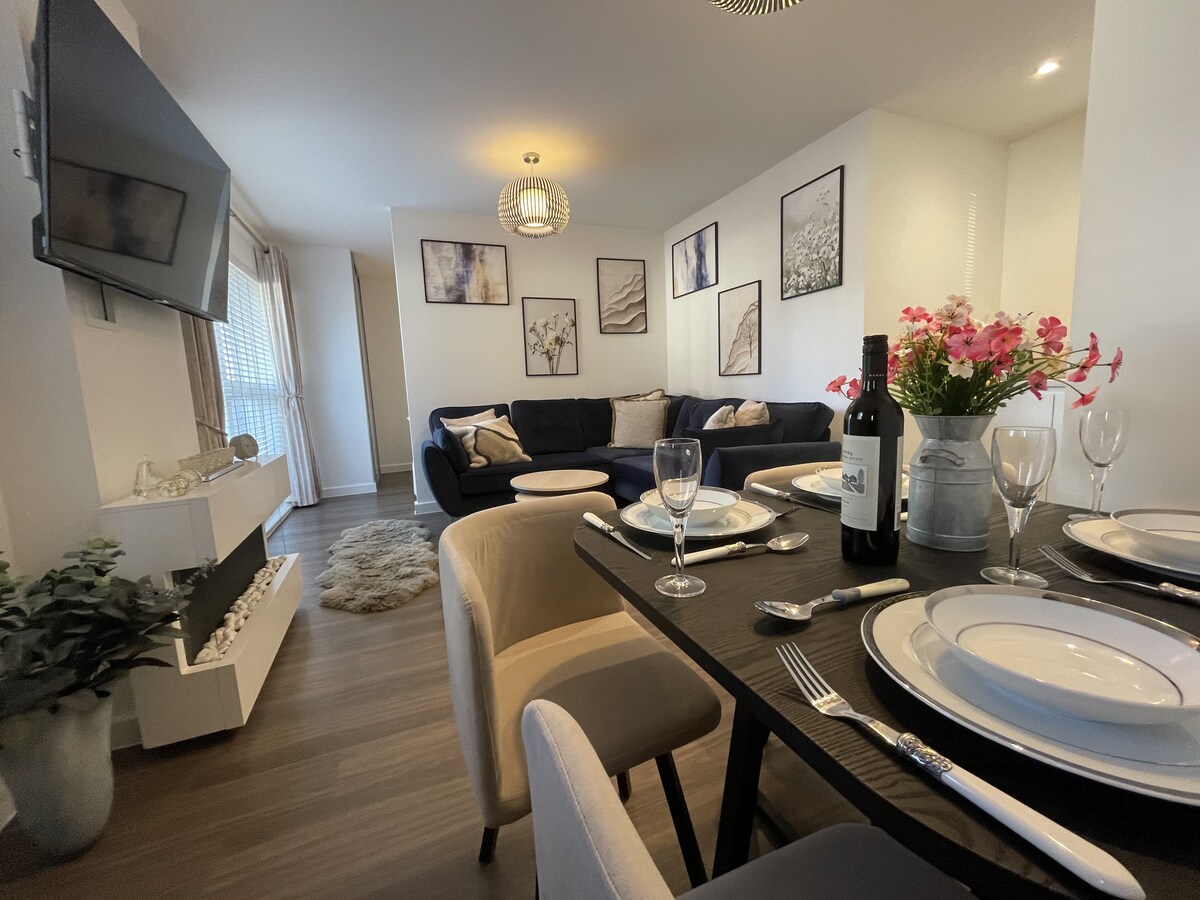 Boravite sa stilom u ovom potpuno novom, modernom dvokrevetnom stanu pored tržnog centra Lejksajd! Kupujte, večerajte i zaronite u noćni život, a London je udaljen samo 20 minuta vožnje putem A13. Bluewater ima samo 15 minuta! Za 4 osobe sa 1 kupatilom + spojenim kupatilom, kompletna kuhinja, balkon sa baštenskim stolicama i stolom, Pametni TV od 65inča, besplatan Wi-Fi, peškiri i posteljina. Savršeno za porodice, prijatelje, grupe i poslovna putovanja. 1 besplatno parking mjesto. Događaji/zabave nisu dozvoljeni. Besprekorno čist, svjež i spreman za vašu sljedeću avanturu