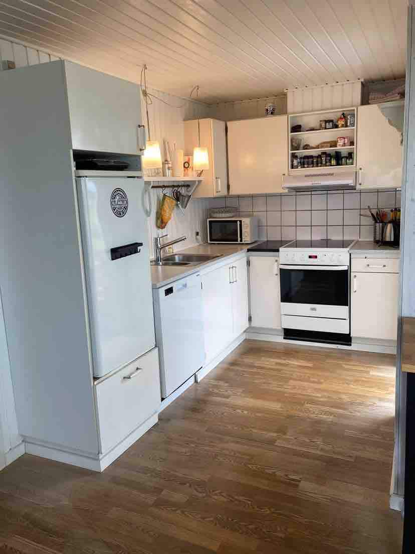 The cottage contains a bedroom with good cupboard wall, a large new bathroom with shower, whirlpool, washing machine, tumble dryer and wall-mounted changing table, a newer kitchen, large living room with wood burning stove, and a smaller room. There is access to a large raised wooden terrace. The cottage is a lovely older romantic house. There is internet with free data and TV.