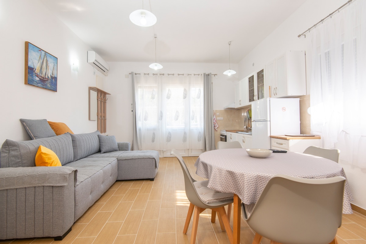 The studio/apartment is located on the first floor of the house and features its own kitchen, bathroom, and private balcony. From the balcony, you can enjoy beautiful views of Boka Bay and the Verige Strait. Guests also have access to the terraces in front of the house, which are arranged on three levels. These terraces offer dining and coffee tables, as well as an outdoor shower — perfect for relaxing and enjoying the fresh sea air.